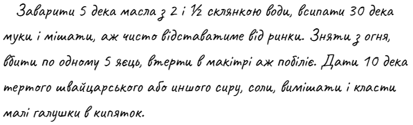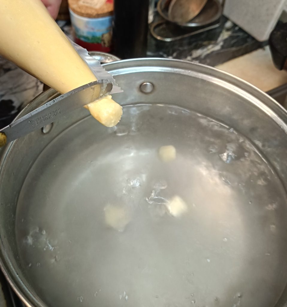 - У киплячу воду витискати з мішка маленькі галушки, відрізаючи їх ножем.