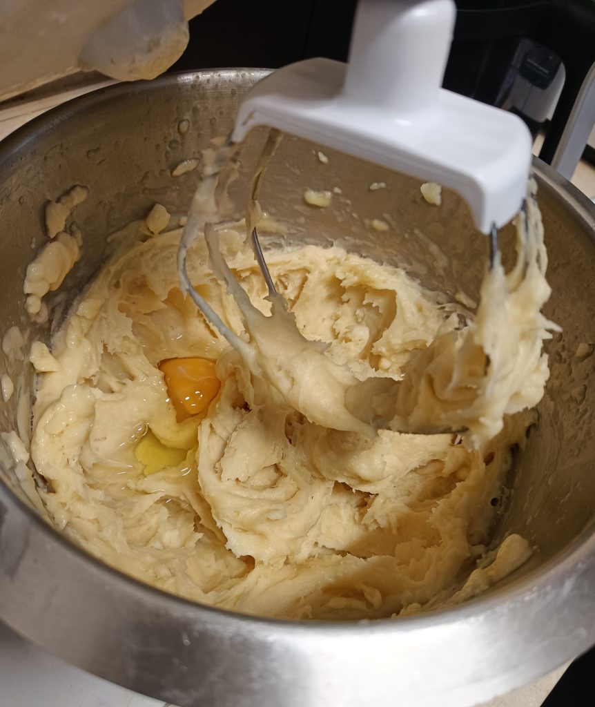 - Почекати, щоб тісто трохи вистигло, місити в комбайні, додаючи по одному яйця.