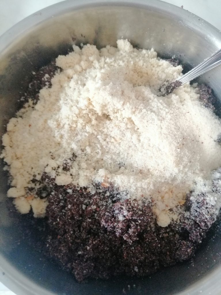 2. Додати міґдалову муку, гіркі міґдали, порошок до печива, сухарі.