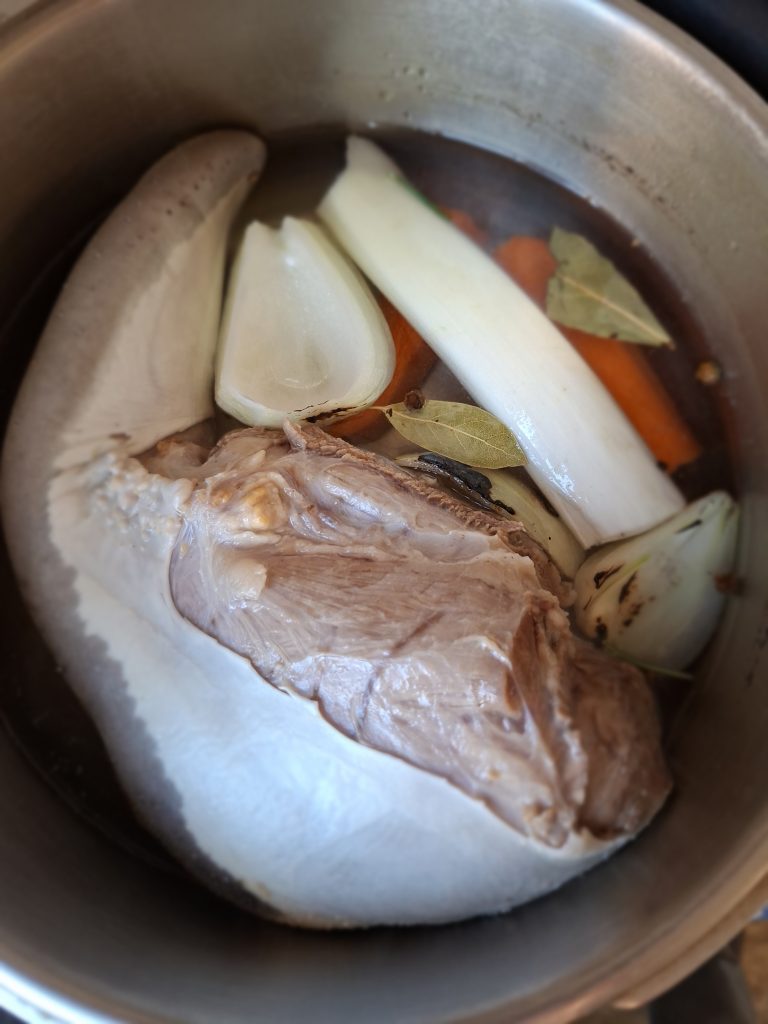 • Язик вийняти з росолу, покласти в холодну воду, щоб підстиг.