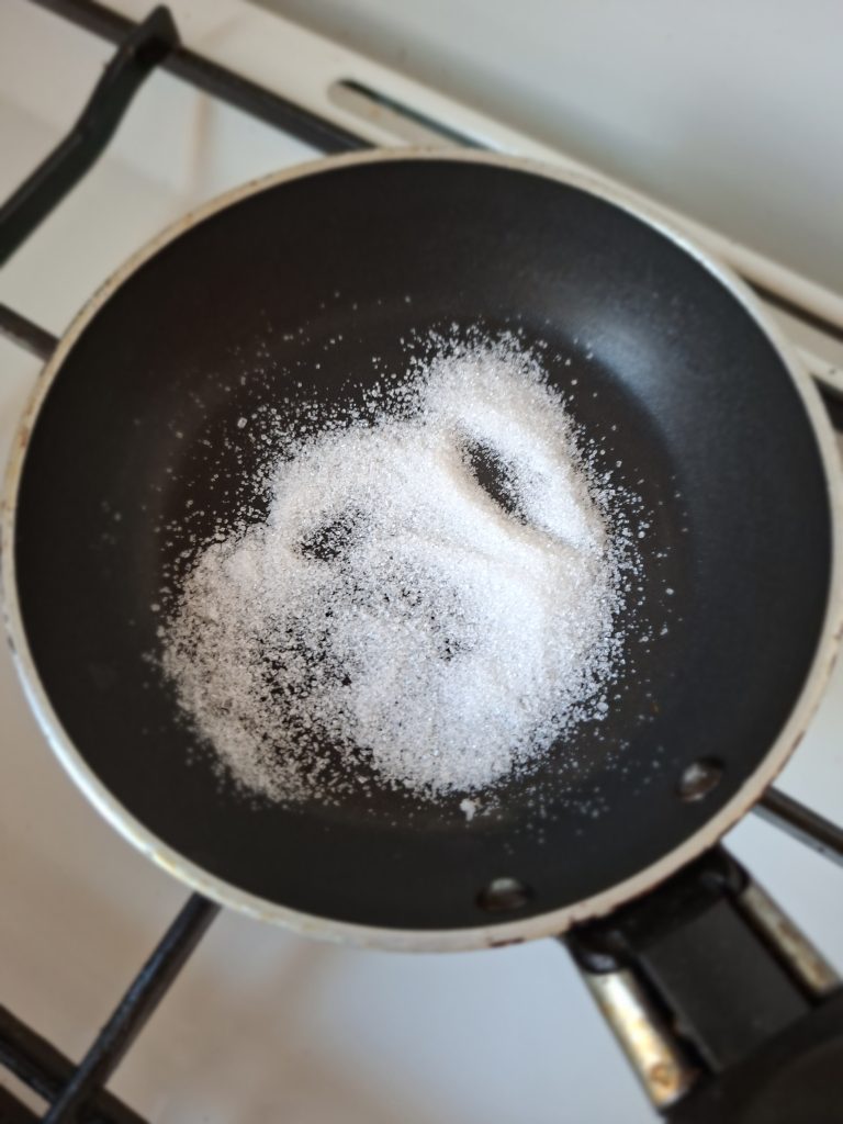 1. У невеликій пательні розтопити цукор, постійно помішуючи, поки він трохи потемніє. Тоді налити росіл, добре перемішати.
