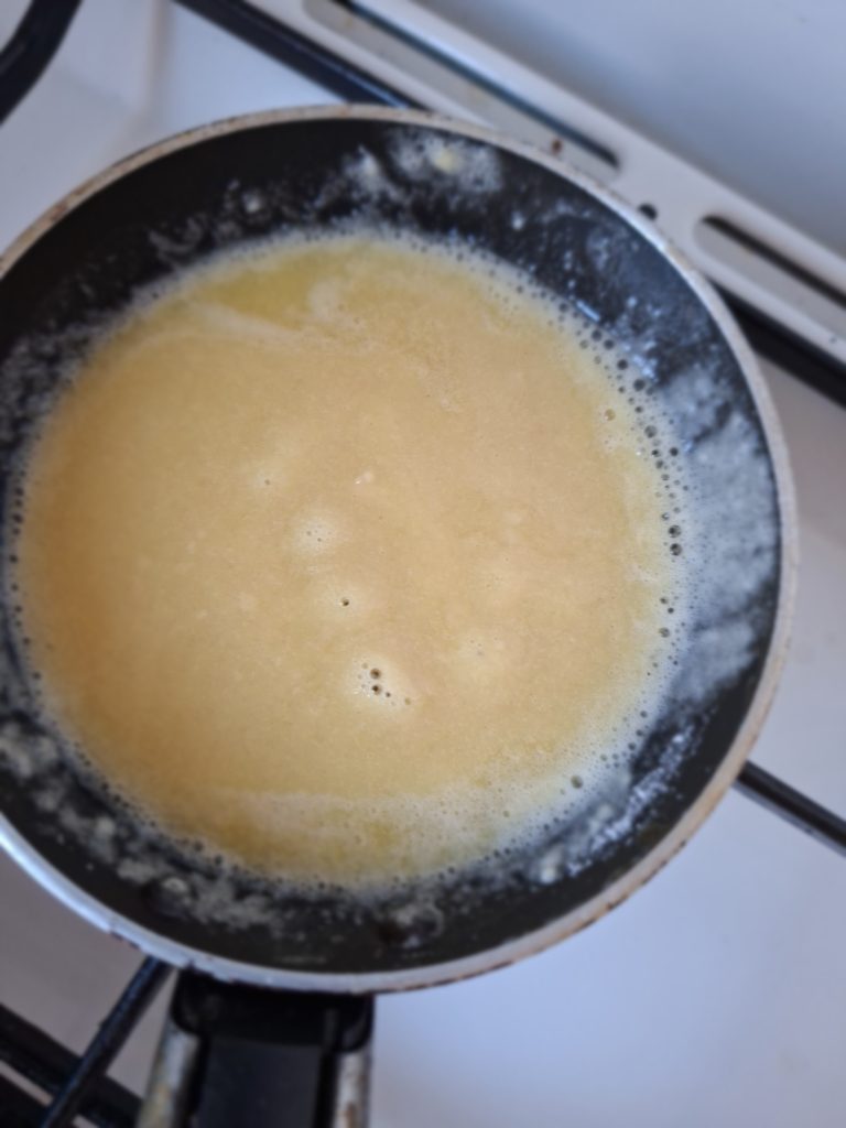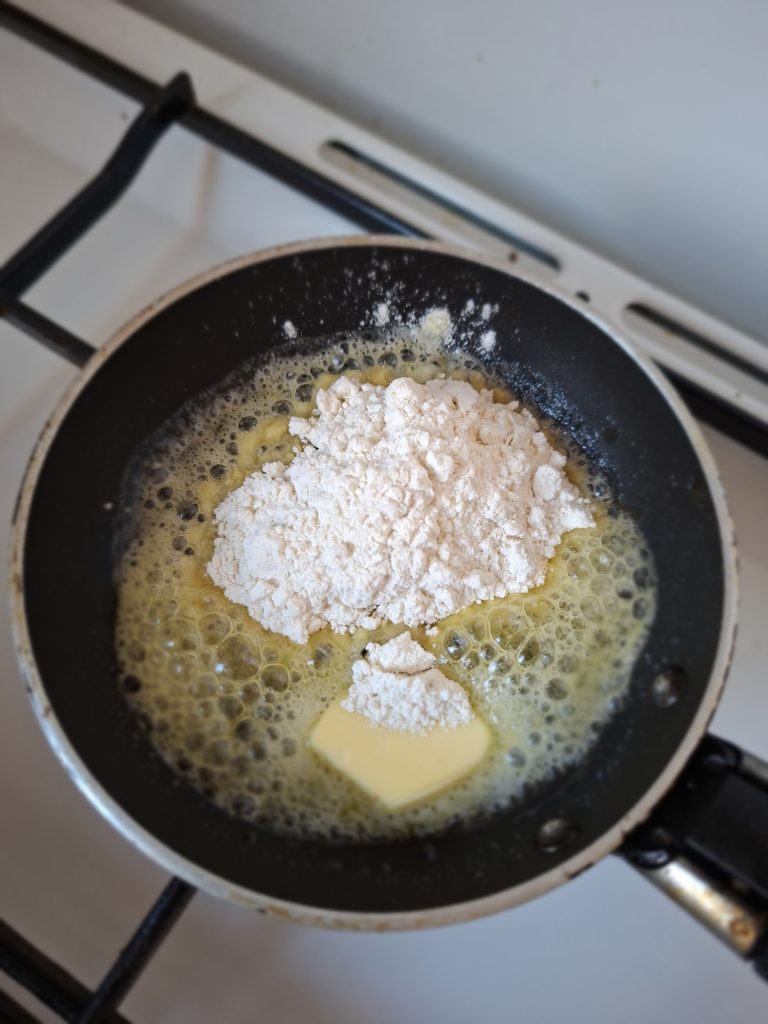 2. Зробити запражку: розтопити масло, додати муку і підсмажити до золотистого кольору.