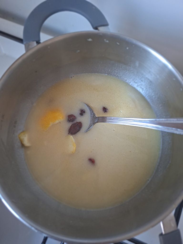 4. Додати родзинки, міґдали, шматочок цедри з цитрини, приправи до смаку. В кінці налити сік з цитрини або трохи оцту. Сос має вийти приємного кисло-солодкого смаку.